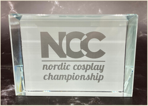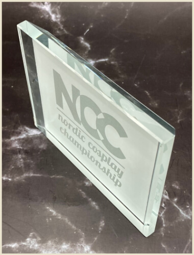 Tung glasplade med hvid bund, der fremhæver graveringen, når den skinner igennem.