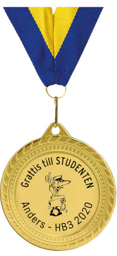 Langt blå-gult medaljebånd og valgfri tekst er inkluderet i prisen.